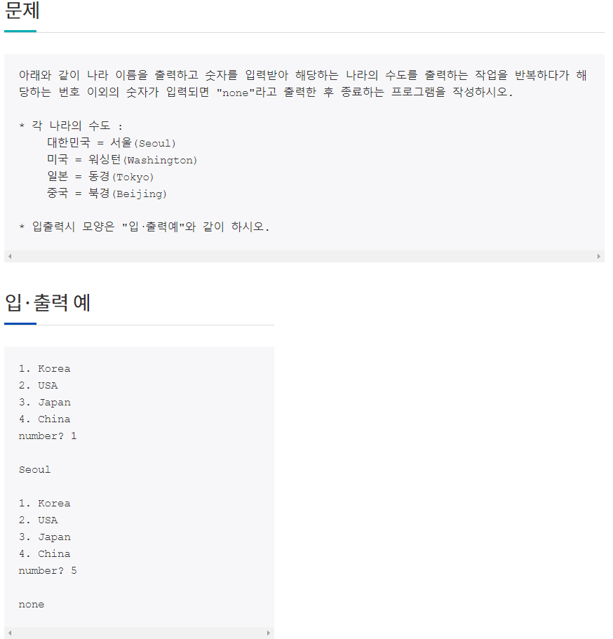 아래와 같이 나라 이름을 출력하고 숫자를 입력받아 해당하는 나라의 수도를 출력하는 작업을 반복하다가 해당하는 번호 이외의 숫자가 입력되면 "none"라고 출력한 후 종료하는 프로그램을 작성하시오.