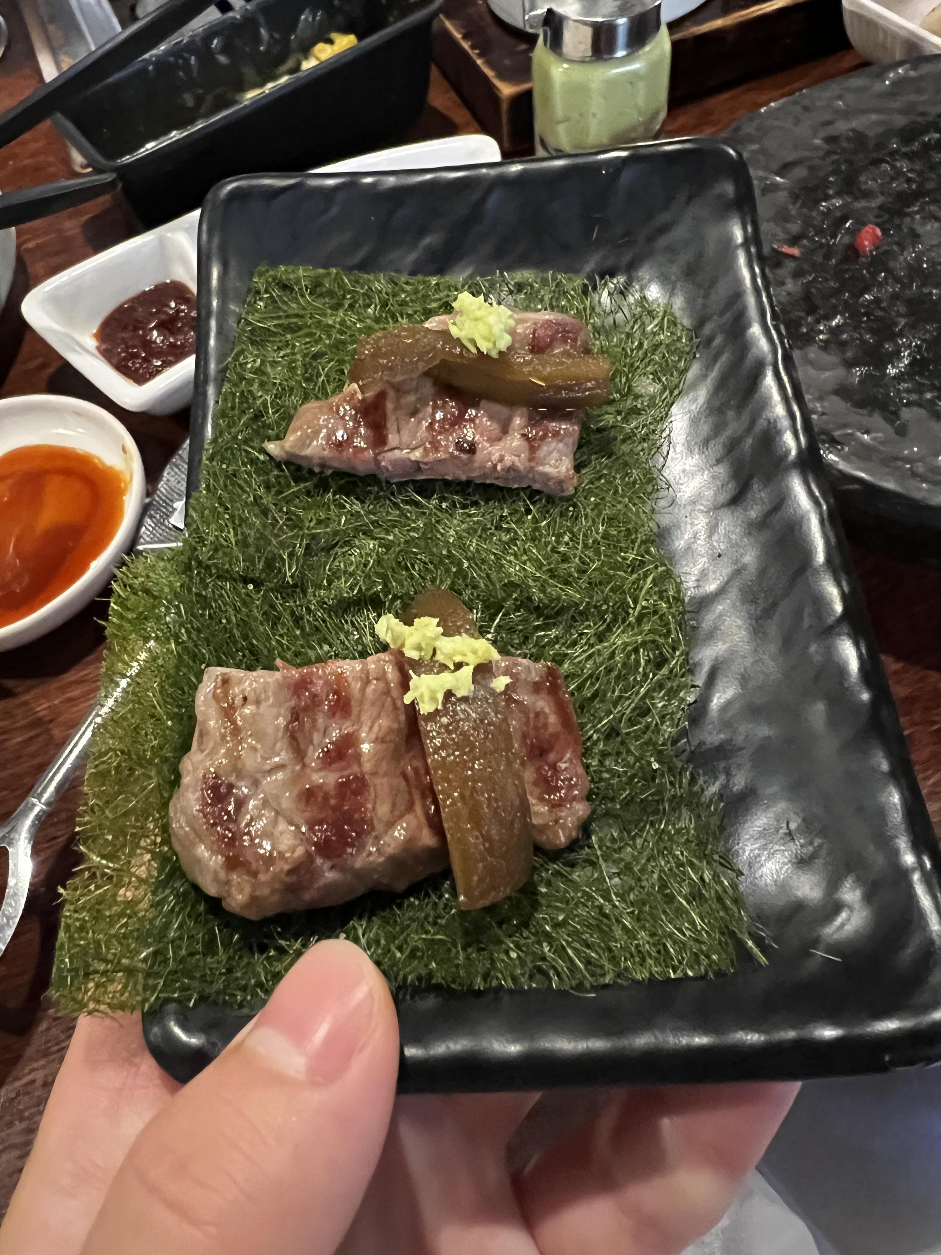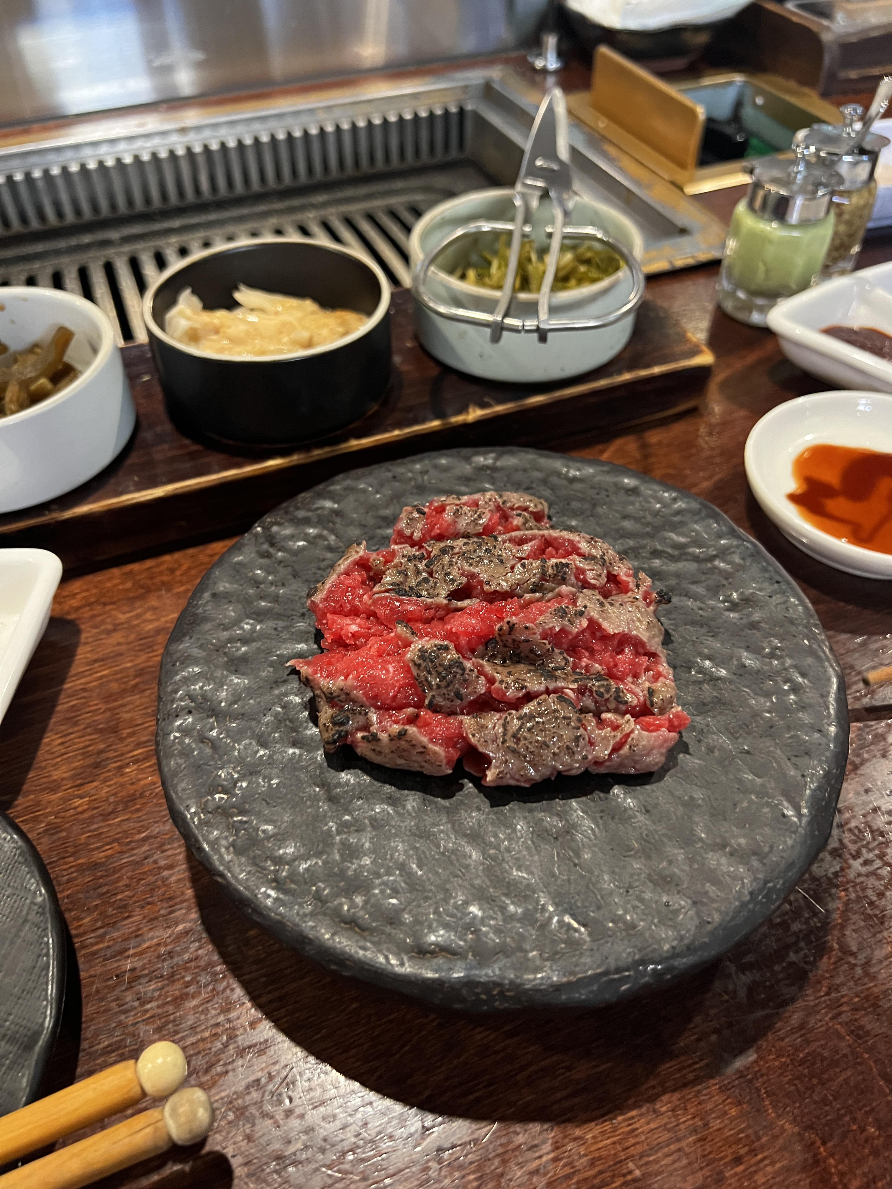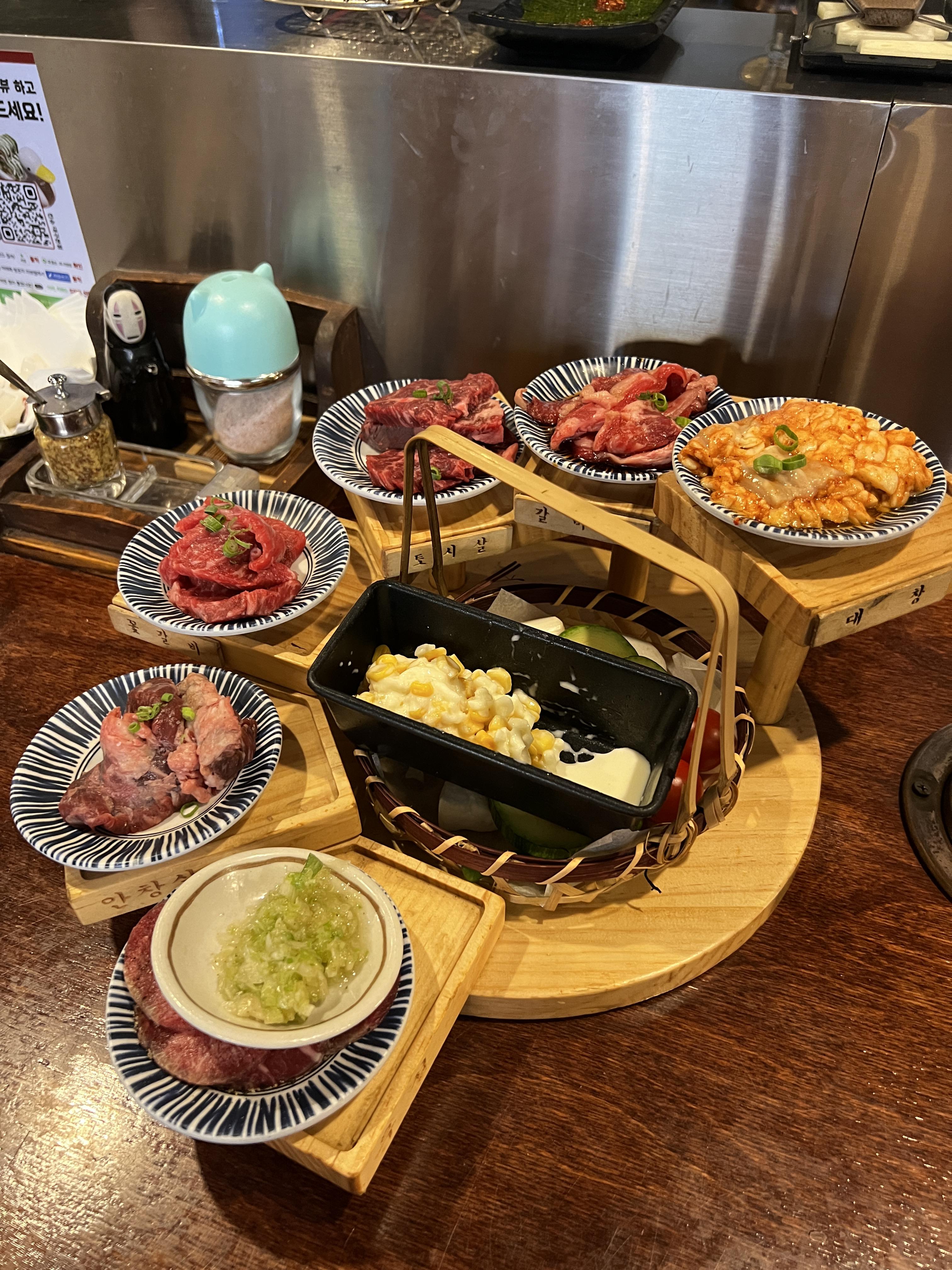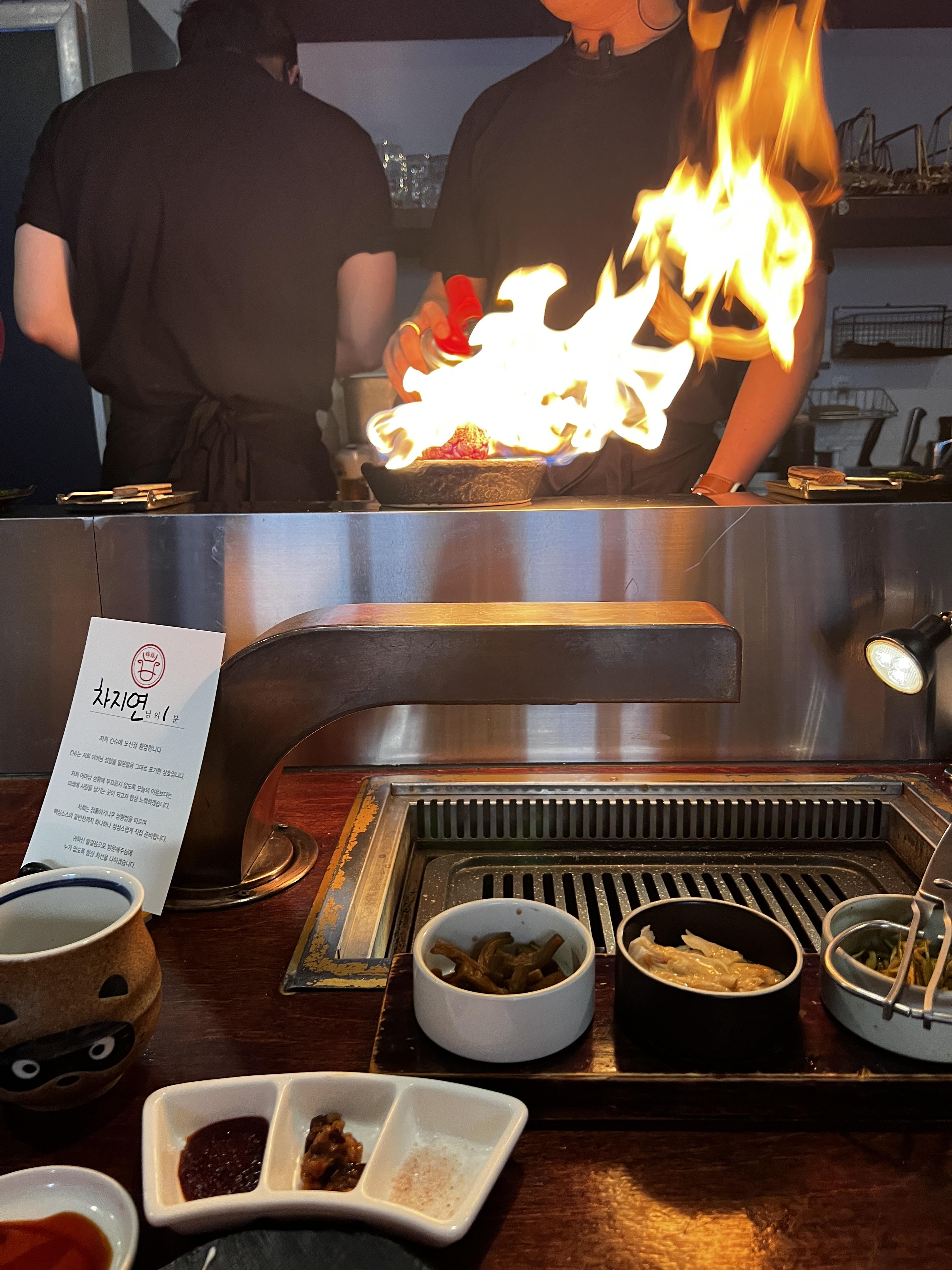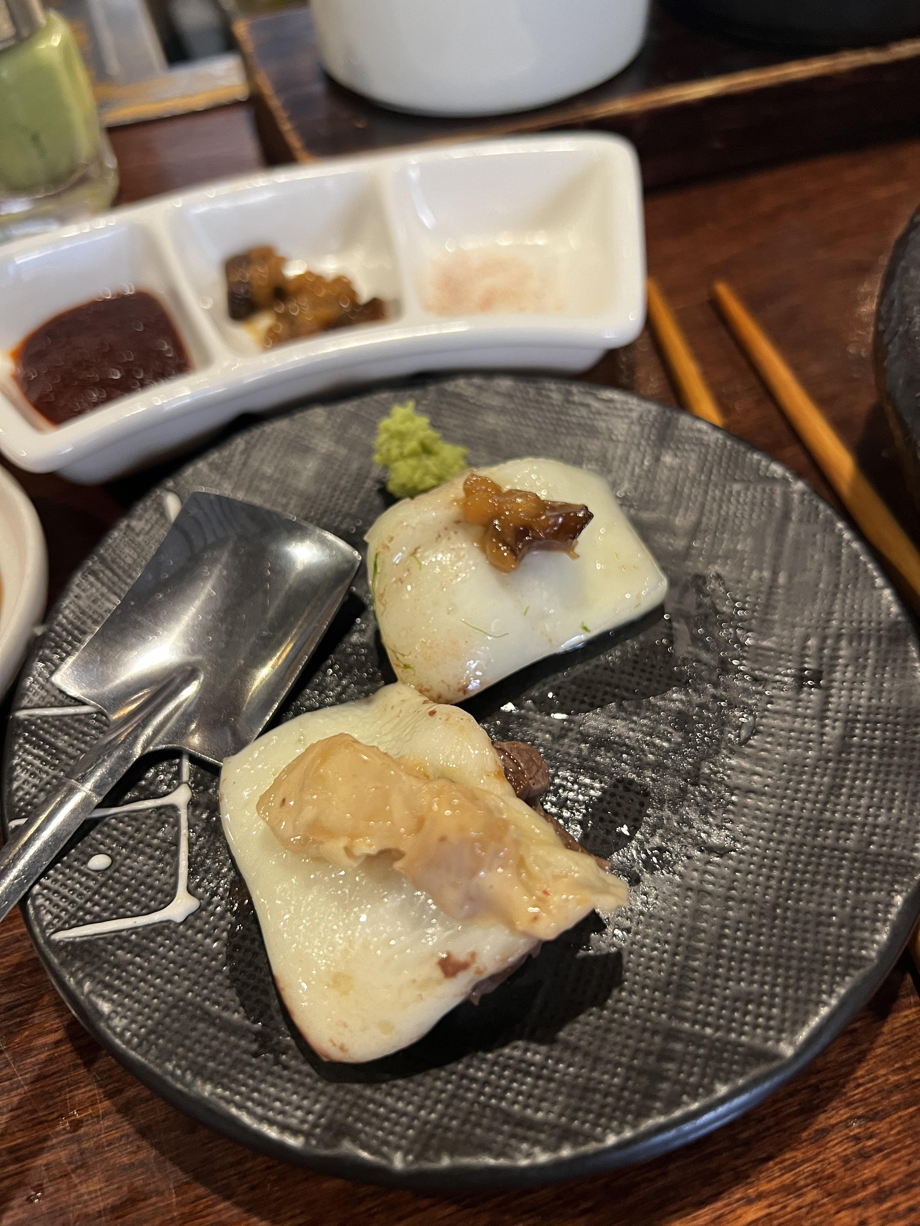 제가 가장 감명받은 건 차돌사시미였는데, 입에 넣자마자 찰지면서도 쫀쫀고소하고 부드러움이 정말 최고였어요. 트러플육회도 맛있지만 갠적으로 트러플향을 좋아하진않아서 ... 전 차돌사시미가 더 좋았어요. 그리고 양념 곱창도 환상적! 곱이 꽉 찬 곱창이 숯불에서 구워지면서 감칠맛이 폭발하는데, 이거야말로 야키니쿠의 완성이 아닐까요? 양이 좀 적었던것 같앗다며 추가로 더 주셨는데 센스모야 ~~~