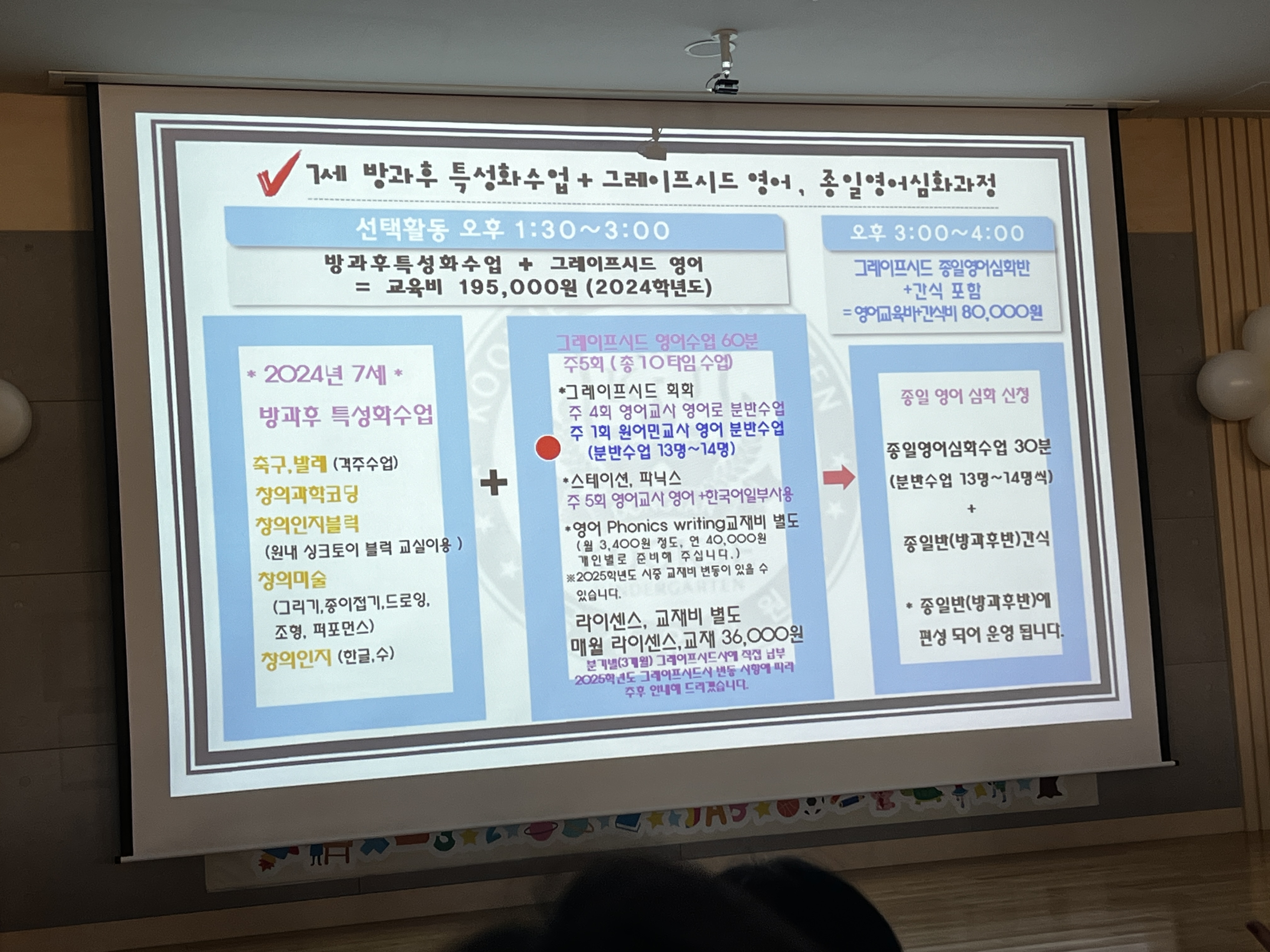 - ⏰ 정규 수업: 오전 9시 30분 ~ 오후 12시 30분 (활동하고 한글, 수학 다양하게 배우는듯)