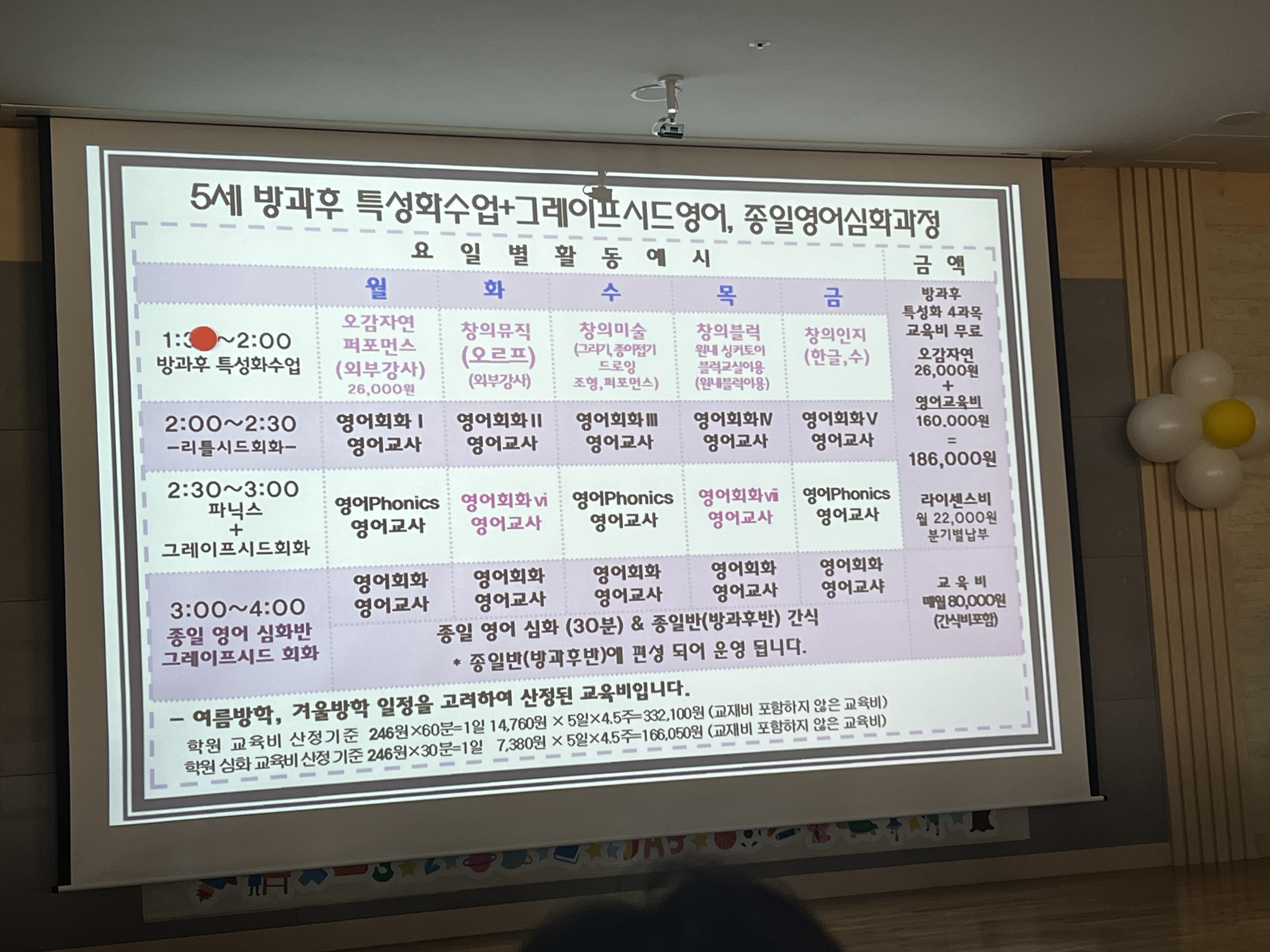 영어 몰입 커리큘럼과 원어민 수업이 주된 교육 방향인 만큼, 이런 부분을 중요하게 생각하시는 분들께는 납득 가능한 수준의 교육비라고 느껴졌습니다 😊