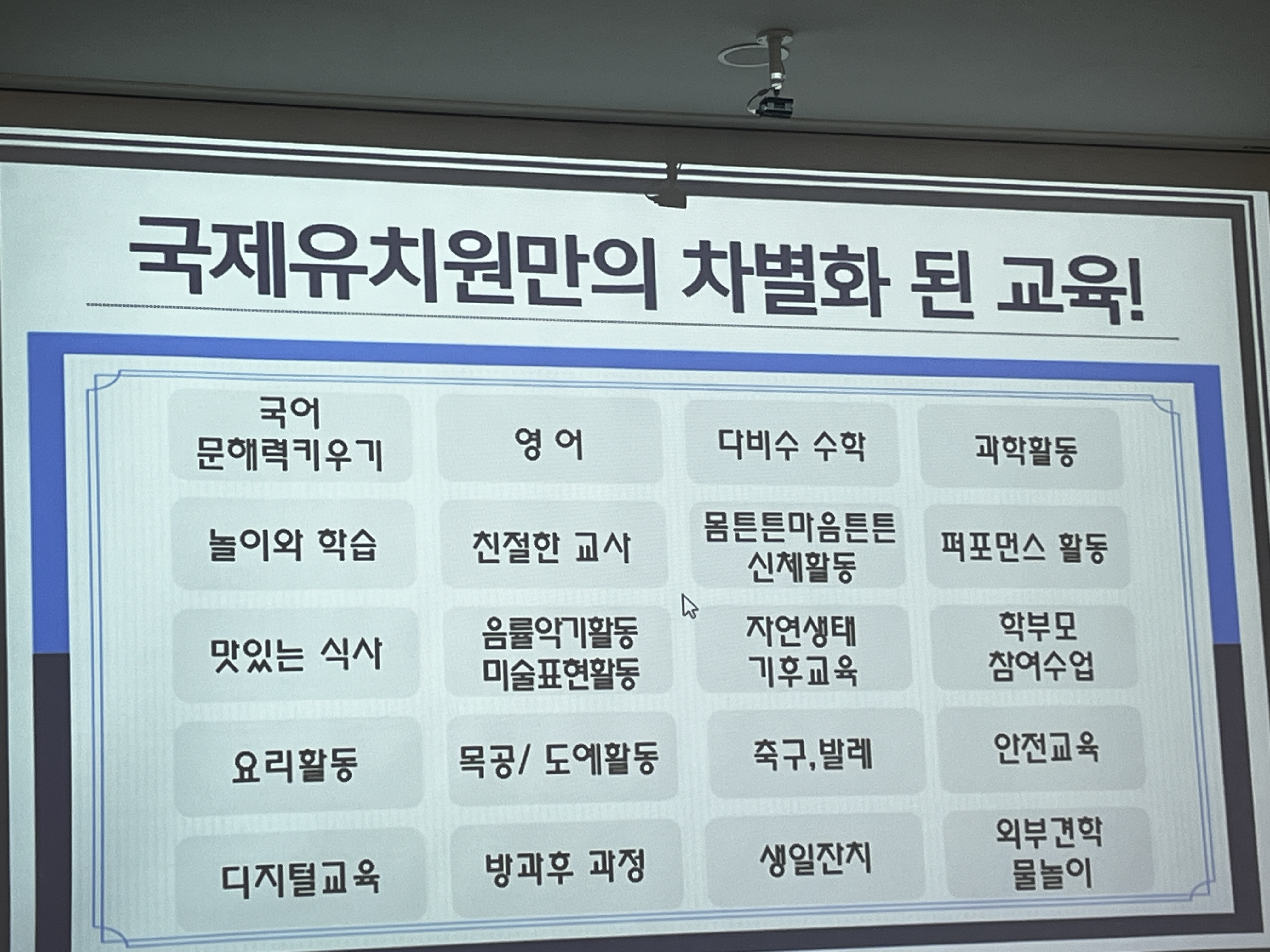 설명회는 부원장님의 인사말로 시작되었습니다. 동탄 국제유치원은 '아이 중심의 전인교육'을 목표로 하며, 놀이를 통한 학습과 다양한 문화 경험을 중요시한다고 강조하셨습니다. 특히, 영어 몰입 교육과 다문화 이해 교육을 통해 글로벌 인재로 성장할 수 있는 기반을 마련해준다고 합니다.